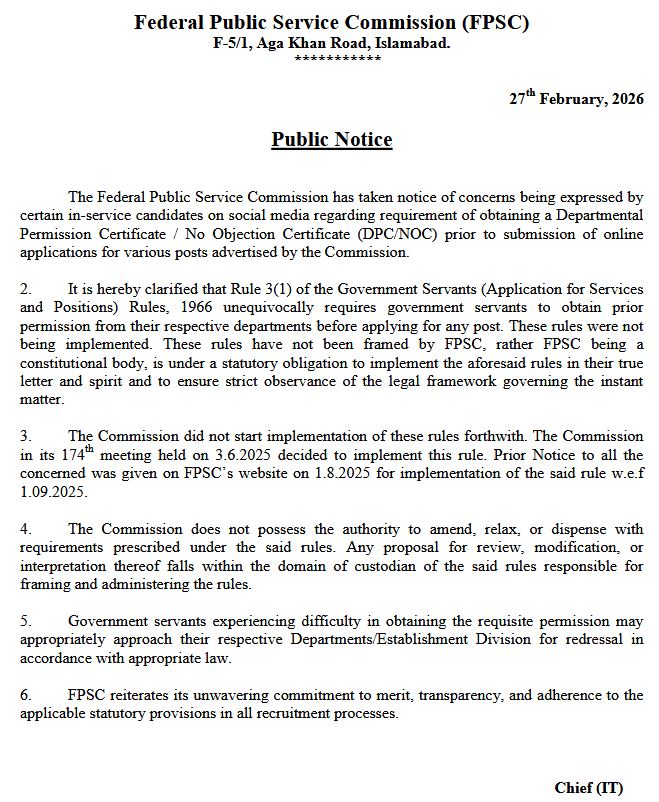 The Federal Public Service Commission plays an important role in ensuring merit-based recruitment of enterprising candidates to the civil/federal Services. In doing so, we have tried to catalyze the development of the country and the progress of the nation.