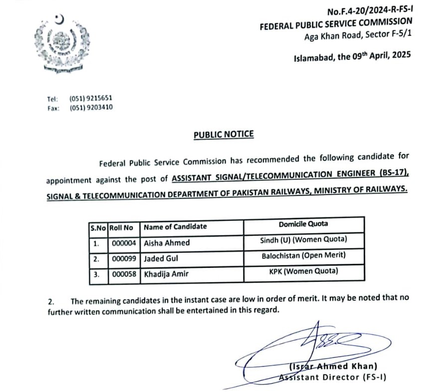 Disclaimer: Official website of FPSC is primary source of information for candidates, therefore, no claim of any candidate shall be accepted if the information intimated on FPSC website is overlooked/ignored by the candidate. Therefore, candidates are required to frequently visit FPSC's website in order to be aware of latest developments.