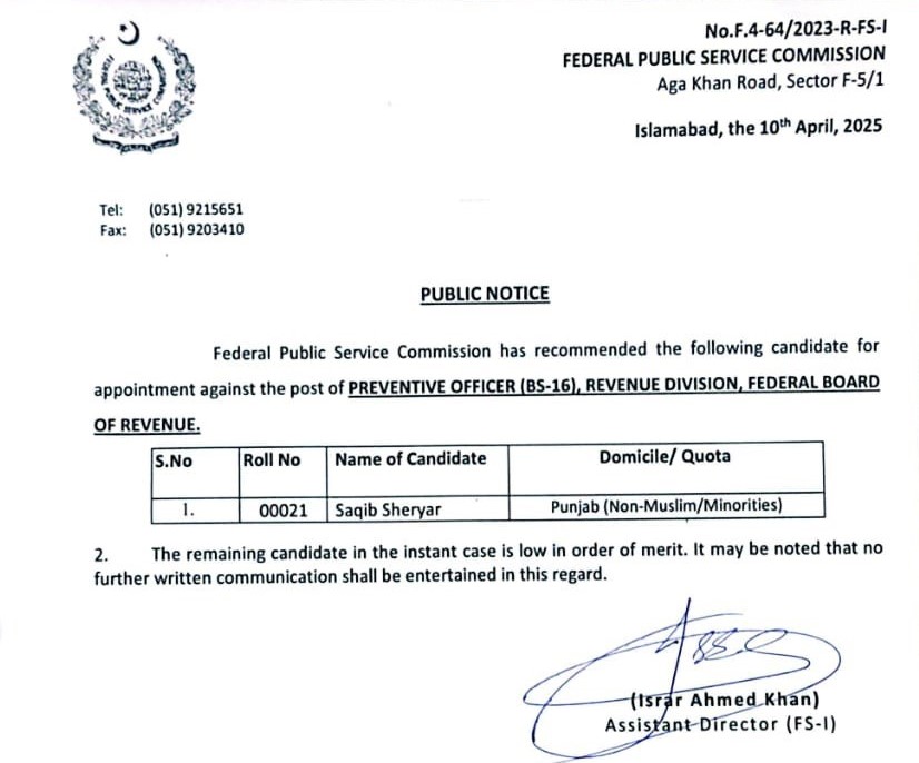 Disclaimer: Official website of FPSC is primary source of information for candidates, therefore, no claim of any candidate shall be accepted if the information intimated on FPSC website is overlooked/ignored by the candidate. Therefore, candidates are required to frequently visit FPSC's website in order to be aware of latest developments.